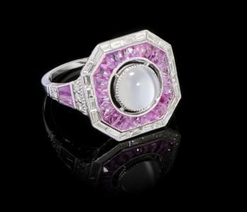 Centrée d'une pierre de lune taille cabochon (env. 2,3 ct) entou...
