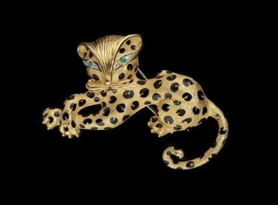 983. Fred, attr. à, broche panthère tachetée d'émail noir, aux yeux s...