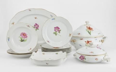 1062. Service à dîner à motif de fleurs sur un fond imitant la vanneri...