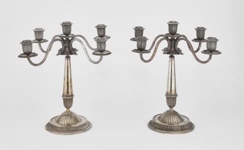 1068. Paire de candélabres néoclassiques à 5 feux, bras de lumière col...