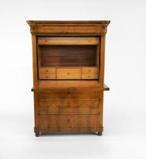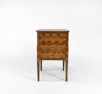 Bois fruitier et filets de bois noirci, deux tiroirs et un abatt...