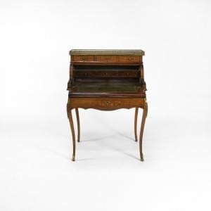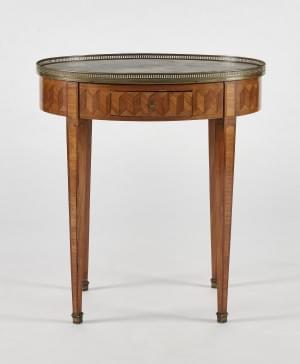 Tirettes et tiroirs, marqueterie de bois fruitier, marbre blanc...