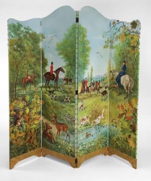 Bois peint à décor de scènes de chasse, 200x200 cm