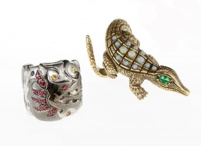 4134. Lot d'une bague crocodile et d'une bague à motif de tête de drag...