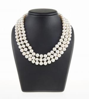 Un collier à trois rangs de petites perles centré d'un motif ser...