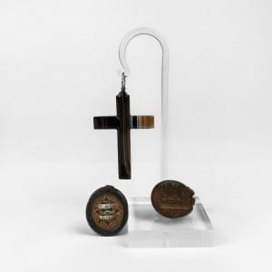 Argent, 32x28 mm. On joint une croix en agate, 6x4 cm, et un cac...