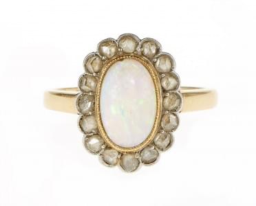 4166. Bague sertie d'une opale cabochon ovale (env. 0,9 ct) entourée d...