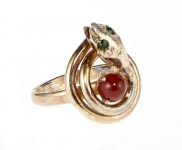 4188. Bague à motif de serpent retenant une cornaline et aux yeux sert...