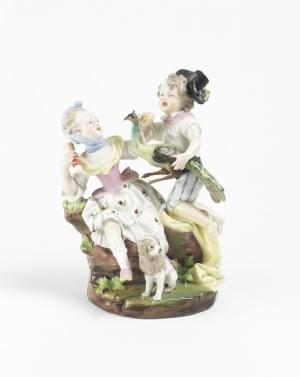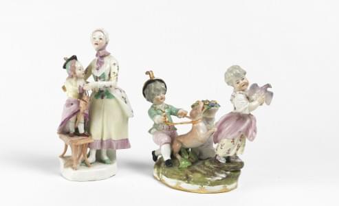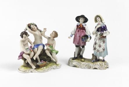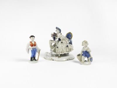 Saxe, un groupe et deux figurines, porcelaine polychrome, H 16 c...