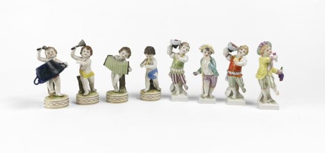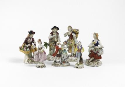 Capodimonte, 7 figurines, porcelaine polychrome, H 9 à 14 cm