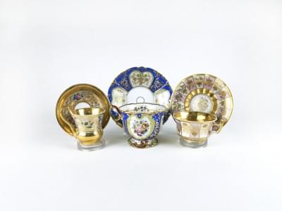 4481. Trois tasses à décor de fleurs or et polychrome