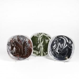 4498. Trois assiettes à décor de cheval ailé, visage et buste feminin