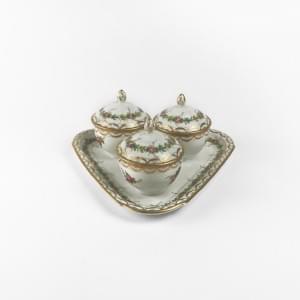 4517. Trois pots couverts sur plateau triangulaire à motif de guirland...