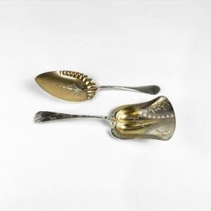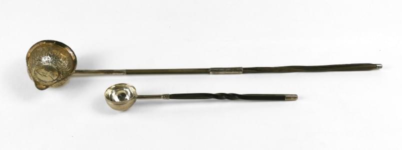 4602. Deux cuillères de service martelées à décor gravé japonisant