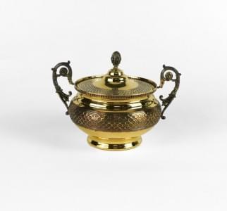 4589. Sucrier à couvercle sur trois gradins, frétel tube polylobé en p...