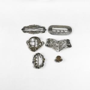 4604. Collection de 5 boucles de ceinture Art nouveau et 1 broche mono...