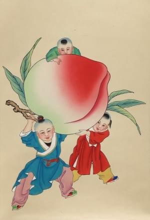 Pêches de longue vie (pan tao xian shou), montée en rouleau, 36x...