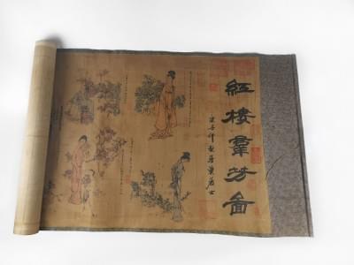 Impression sur soie à décor de caractères et jeunes femmes, 390x...