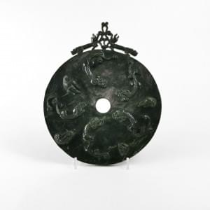 Jade épinard à décor d'animaux mythiques et de flammes, D 27 cm