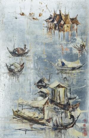Bateaux de pêche et maison sur pilotis, technique mixte sur pann...