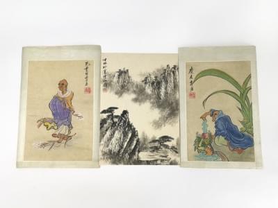 Un paysage et deux personnages, ensemble de trois aquarelles sur...