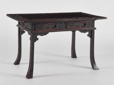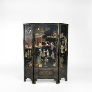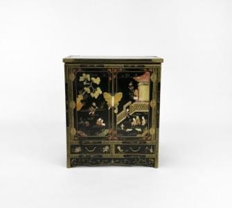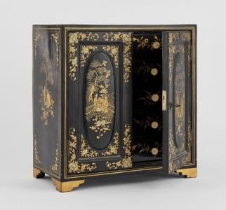 Deux vantaux dissimulant cinq tiroirs, laque noire et or à motif...