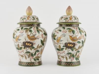 Porcelaine émaillée polychrome à décor de pivoines et volatiles,...