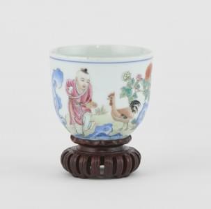 Porcelaine polychrome à décor d'un garçon et son coq et calligra...