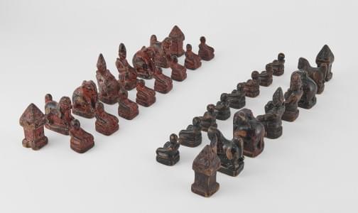 Bois sculpté et patiné, bois laqué noir et rouge, H roi 8,5 cm