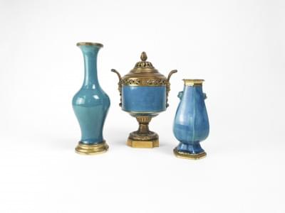 Porcelaine émaillée monochrome, montures en bronze doré, formes...