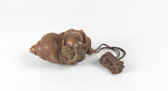 Bois sculpté à décor d'animaux, L 12 cm. Le netsuke représente u...