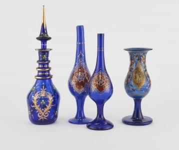 Verre bleu à décor polychrome et or, H de 23 à 37 cm