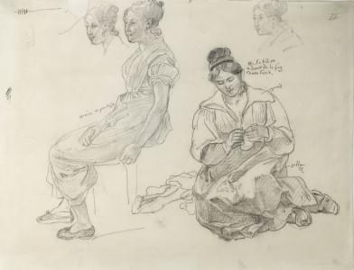 Etude de femmes bras croisés et croquis de femmes assises, mine...