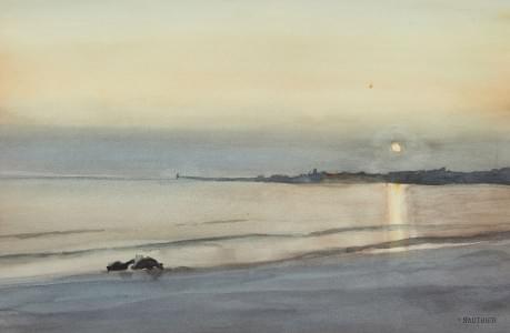 Plage au bord du lac, aquarelle sur papier, signée, 31x47 cm