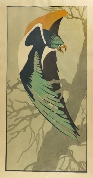 Paire de rapaces, pochoirs, signée E. Rieder, 54x30 cm