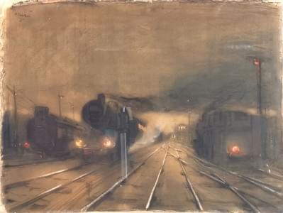 Locomotives, pastel sur papier, signé et daté 1915, 39x51 cm