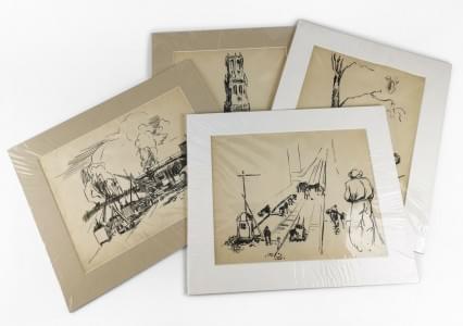 Quatre esquisses à la plume figurant des scènes de Brest, encre...