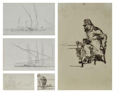 Ensemble de cinq dessins: l'homme attablé, barques et vapeur au...