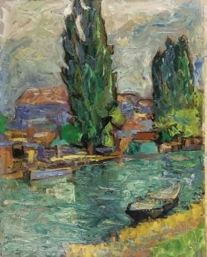 Canal de Bienne, huile sur carton, étiquette de l'artiste au dos...