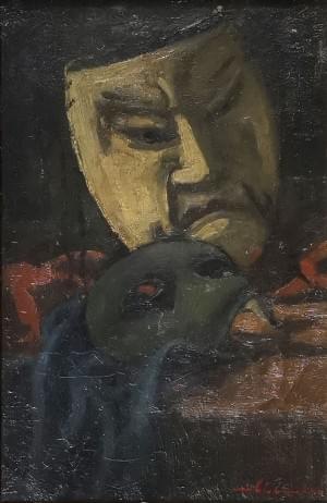Masques de théâtre, huile sur toile, signée, 48x28 cm