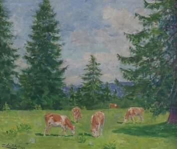 Paysage alpin avec des vaches, huile sur toile, signée et datée...