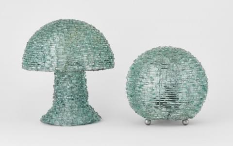 Tessons de verre assemblés sur une âme en métal, H 25 et 35 cm (...