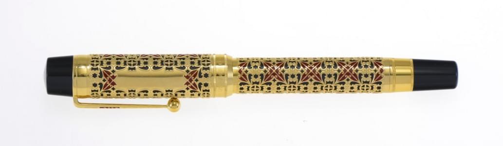 Cadran doré, index bâton et aiguilles noirs, date à guichet à 3h...