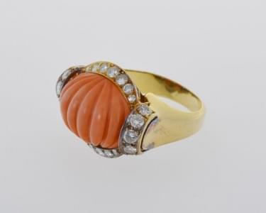 55. Bague ornée en son centre d'un cabochon de corail godronné dans...