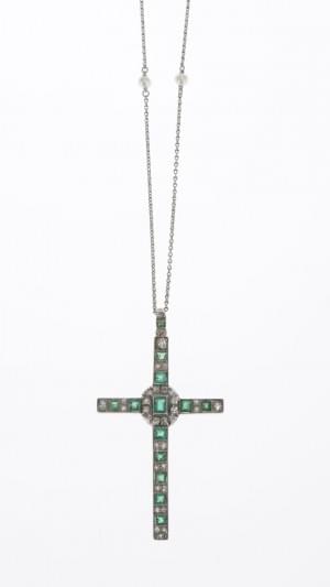 67. Collier ponctué de perles retenant un pendentif croix serti d'ém...