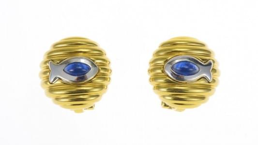 86. Fred, paire de clips d'oreilles en or godronné ornés de saphirs...