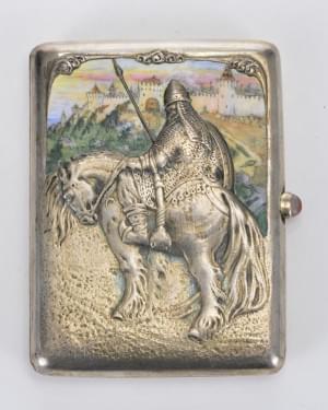 142. Boîte à cigarettes à décor repoussé d'un chevalier devant une fo...