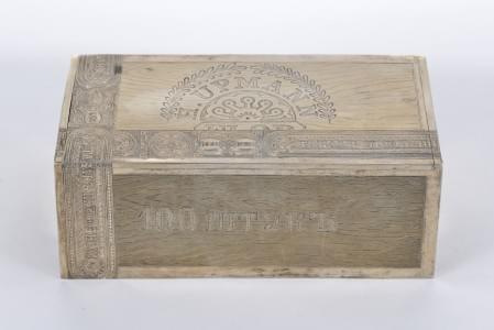 156. Boîte à cigares en trompe-l'œil de ruban et inscriptions en cyr...