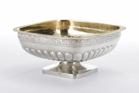 159. Coupe carrée sur piédouche à bordure de palmettes et motif de go...