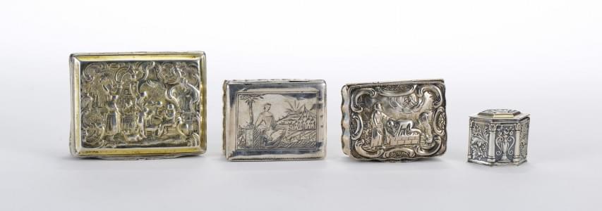 171. Collection de 4 boîtes à décor repoussé et gravé de fleurs, scèn...